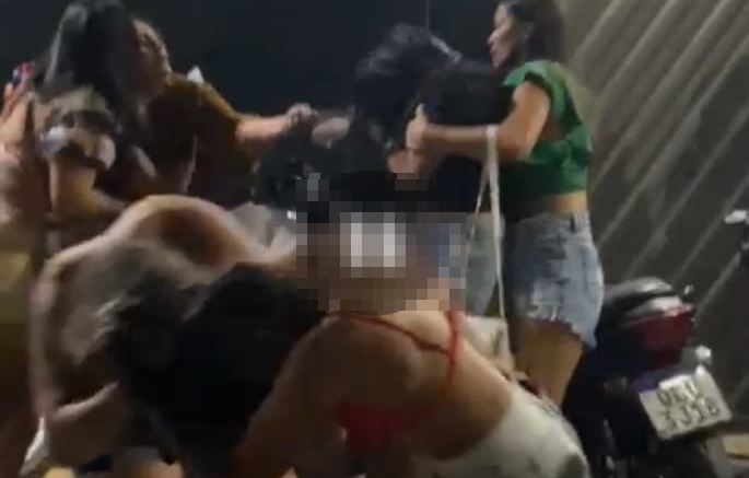 Por meio das imagens, é possível observar as mulheres caindo em cima de um motocicleta estacionada, continuando o combate nas margens da via.