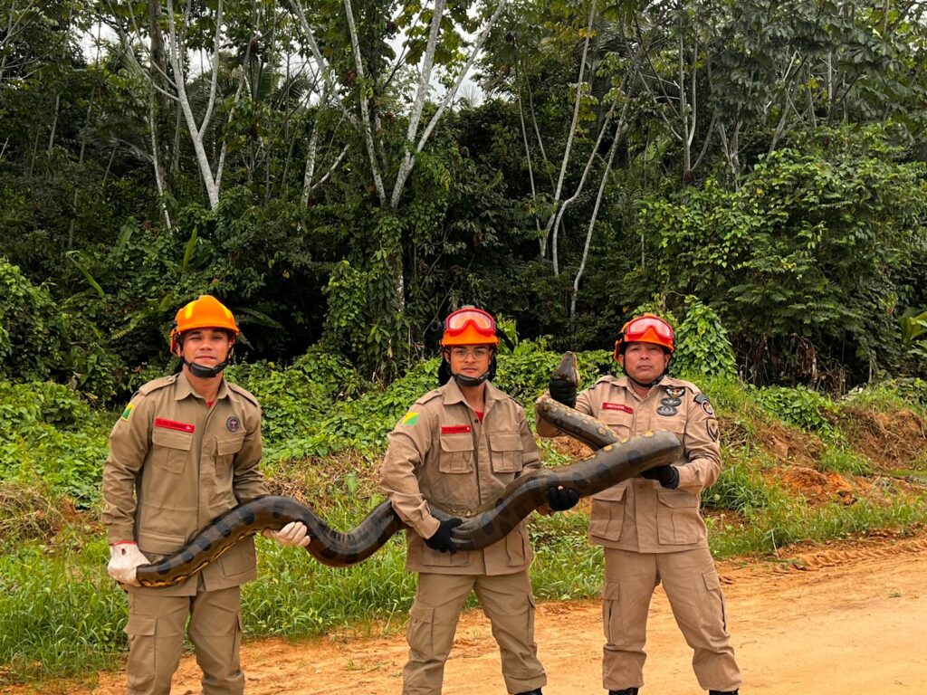 Nesta quarta-feira (19), uma sucuri de aproximadamente 4 metros foi capturada pelo Corpo de Bombeiros em uma área de mata, no Ramal da Gazin, situado na Variante, em Cruzeiro do Sul.