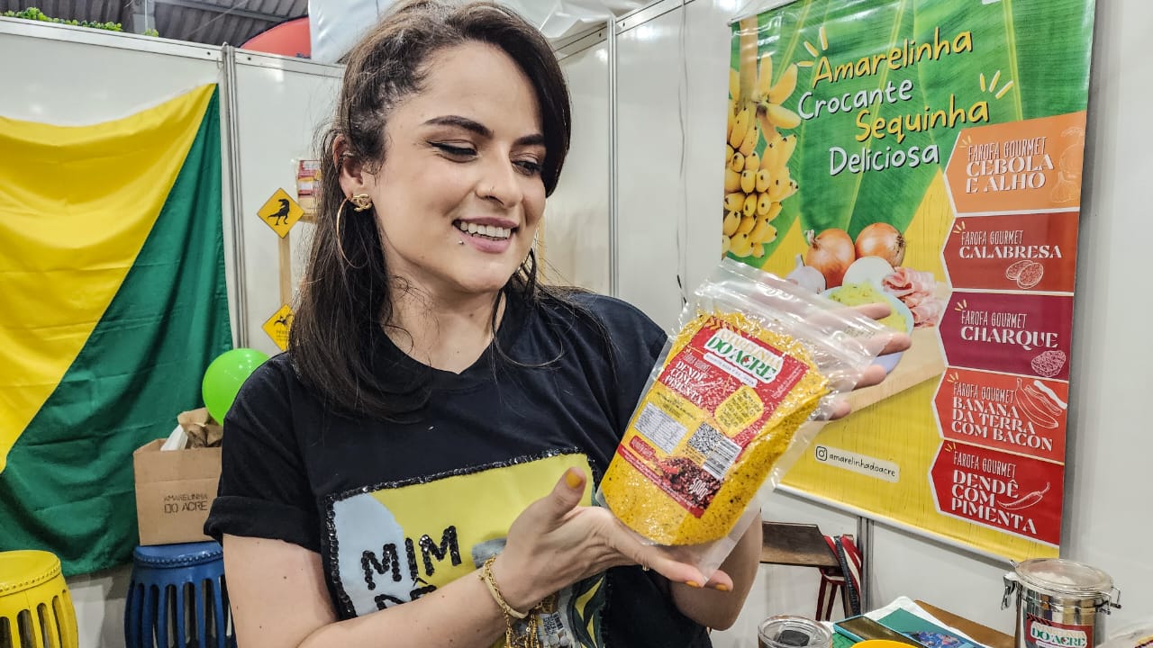 A Expoacre 2023 é uma vitrine para pequenas empresas do Acre e ajuda a alavancar o nome de produtos genuinamente acreanos. Em um dos estandes da Economia Criativa da Feira, estão expostos os produtos da ‘Amarelinha do Acre’, uma farofa artesanal que já chegou em 7 países diferentes.