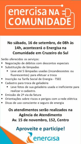 De acordo com o coordenador comercial da Energisa, Pedro Henrique, para participar do evento e realizar qualquer atendimento, o cliente deverá portar os documentos pessoais e a conta de energia.