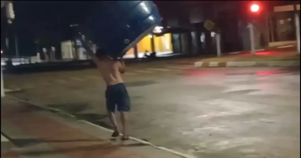 O primeiro registro aconteceu na sexta-feira, 15. Um vídeo mostra dois homens levando uma caixa d’água e a tampa nas costas pelo centro da cidade, indo em direção ao Bairro da Lagoa.