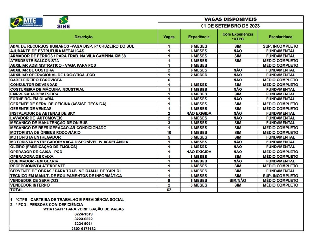 O Sistema Nacional de Emprego do Acre (Sine) disponibiliza 62 vagas para diversas áreas nesta sexta-feira (1) em Rio Branco. O atendimento está sendo feito exclusivamente por telefone.