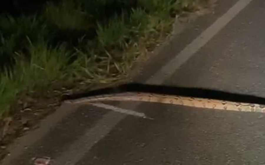 Na noite desta terça-feira, 12, uma jiboia foi flagrada atravessando a Variante em Cruzeiro do Sul, no período da noite. O motorista de um ônibus, que passava pelo local, parou o veículo e registrou o momento em que a serpente entrava dentro da área de mata, seu habitat.