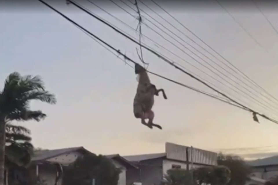 Uma ovelha ficou pendurada na fiação elétrica da Avenida Fernando Ferrari,na cidade de Muçum após a passagem de um ciclone extratropical pelo Rio Grande do Sul.