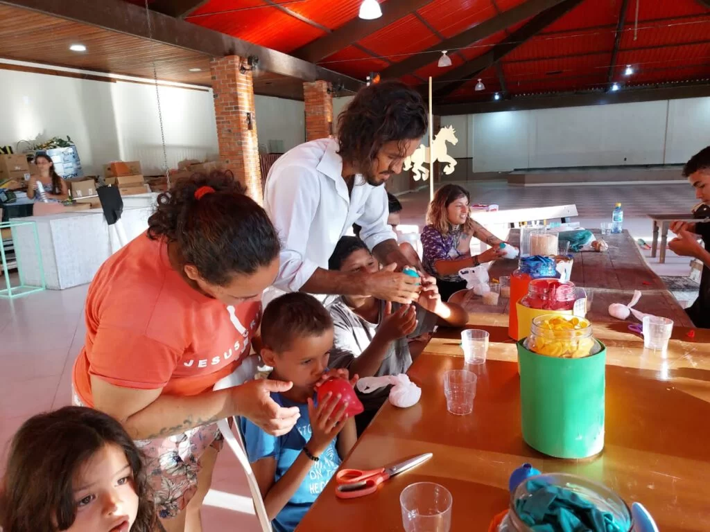 Para as crianças ensina a fazer bolas e a manipulação delas, junto com o equilíbrio. ” Essa arte tem alegria, equilíbrio, atenção, foco e atividade física. Passo isso pra eles “, relatou