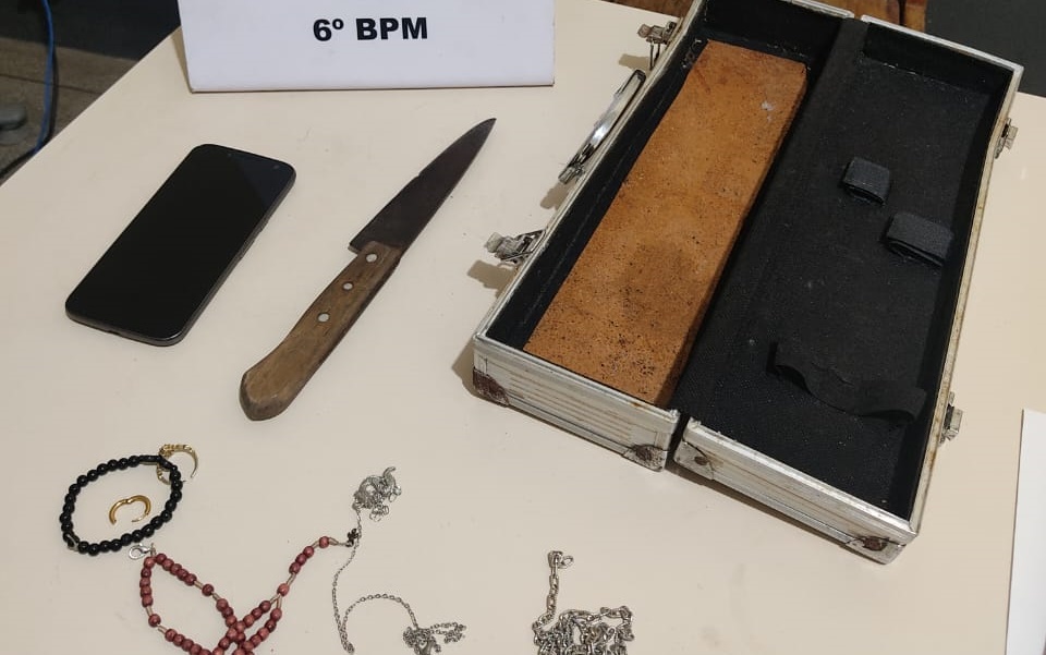 Após descrever as características do acusado que tinha se evadido, a guarnição localizou o indivíduo ainda em via pública, portando uma faca do tipo peixeira.