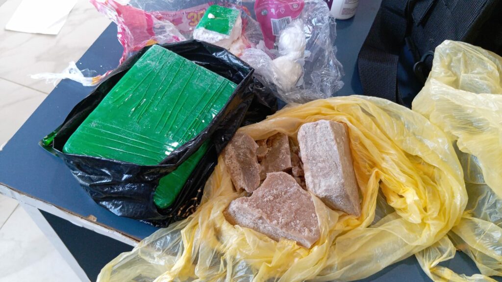 Na mochila foram encontrados quatro volumes aparentando ser cocaína (aproximadamente 900g) e pedra aparentando ser crack (aproximadamente 500g).
