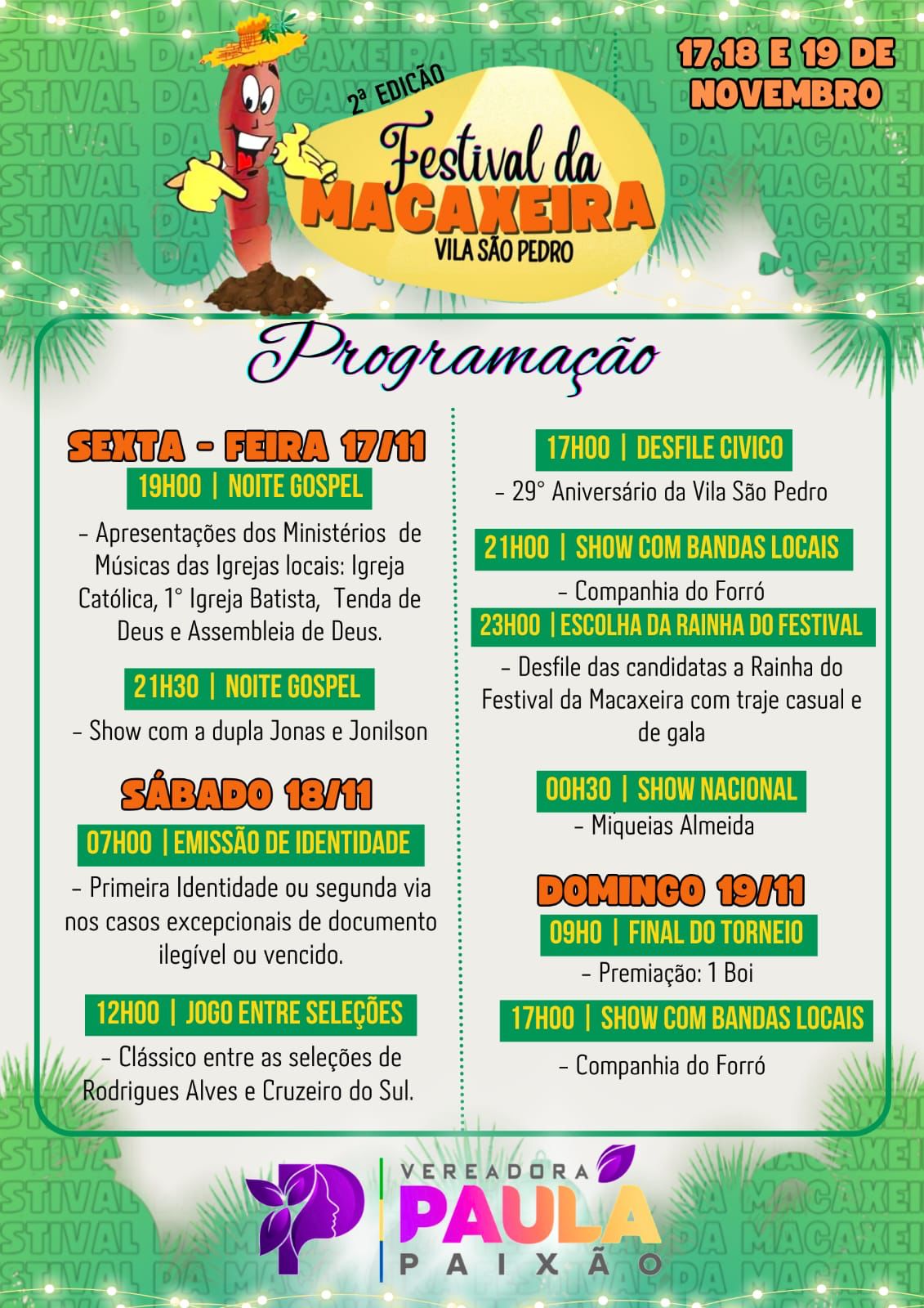 Durante os dias 17, 18 e 19 de novembro acontecerá a 2ª edição do Festival da Macaxeira, na Vila São Pedro, idealizada pela vereadora de Rodrigues Alves, Paula Paixão. A vila está localizada na Rodovia AC-407, onde parte dela pertence ao município de Rodrigues Alves e a outra metade à Cruzeiro do Sul.