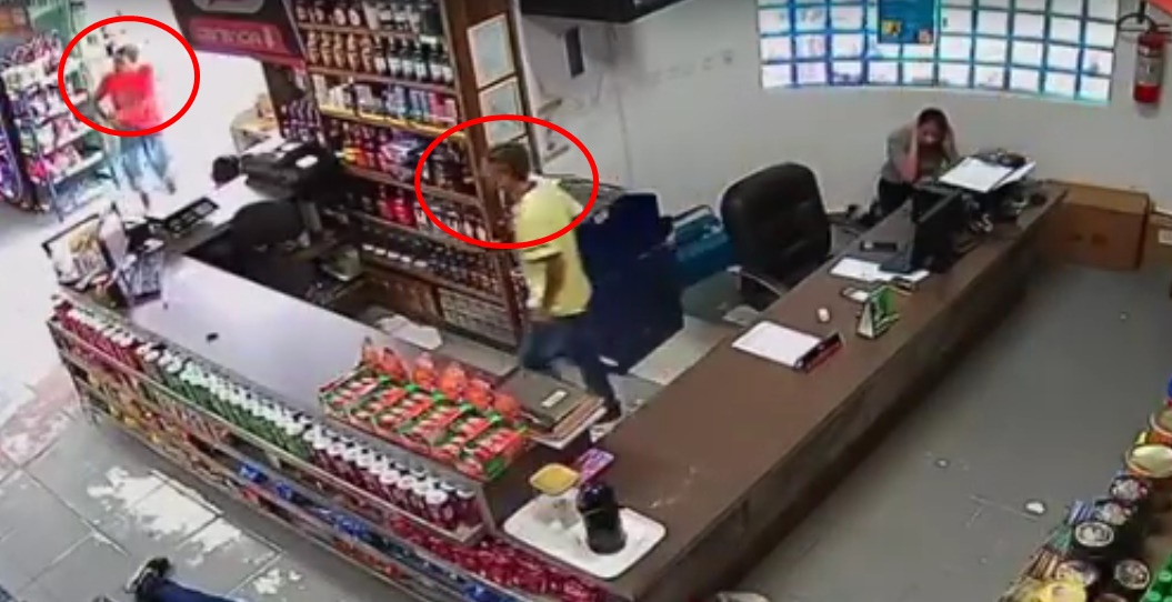 Por meio das câmeras de segurança, é possível observar toda a ação dos criminosos, que surgiram por trás do estabelecimento, de cara limpa, rendendo duas pessoas, possivelmente funcionários, onde um deles se jogou no chão.