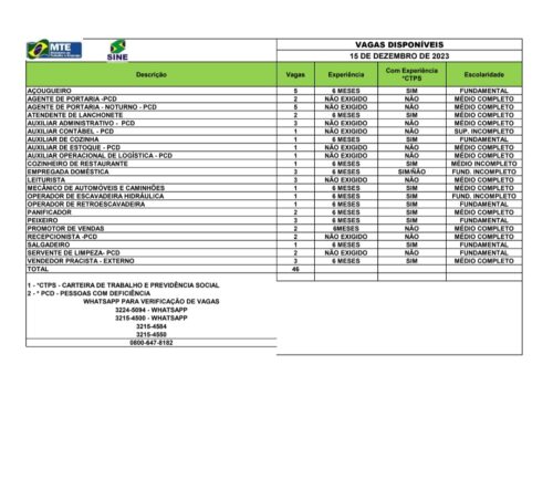 O Sistema Nacional de Emprego do Acre (Sine) divulga 46 vagas de emprego para diversas áreas nesta sexta-feira (15) em Rio Branco.