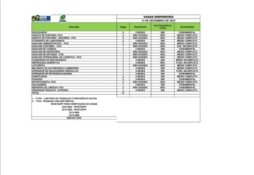 O Sistema Nacional de Emprego do Acre (Sine) divulga 41 vagas de emprego para diversas áreas nesta quarta-feira (13) em Rio Branco.