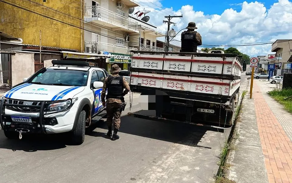 Durante um patrulhamento, os militares avistaram o caminhão e fizeram a abordagem, identificando 40 dúzias de tábuas, totalizando 9 metros cúbicos de madeira do tipo “Toari”, sem a documentação necessária.