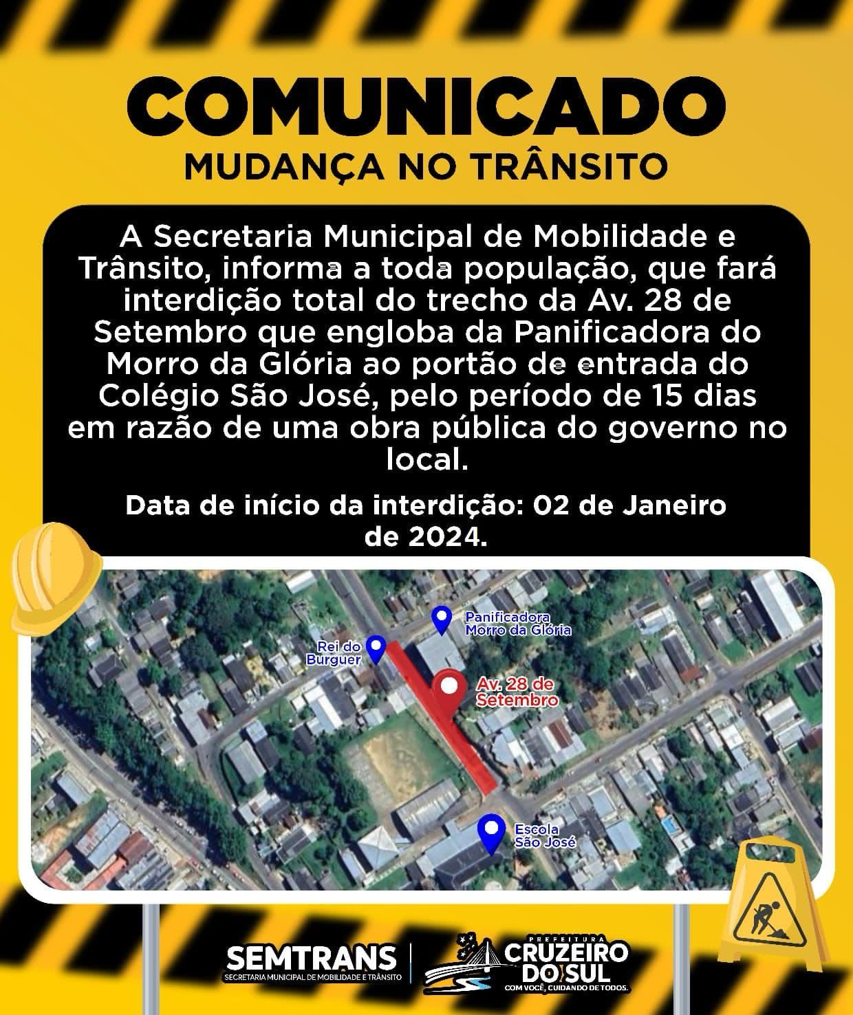 Nesta terça-feira, 26, a Prefeitura Municipal de Cruzeiro do Sul, através da Secretaria Municipal de Mobilidade e Trânsito, emitiu um comunicado a respeito da interdição total da Avenida 28 de Setembro, situada no bairro Morro da Glória.