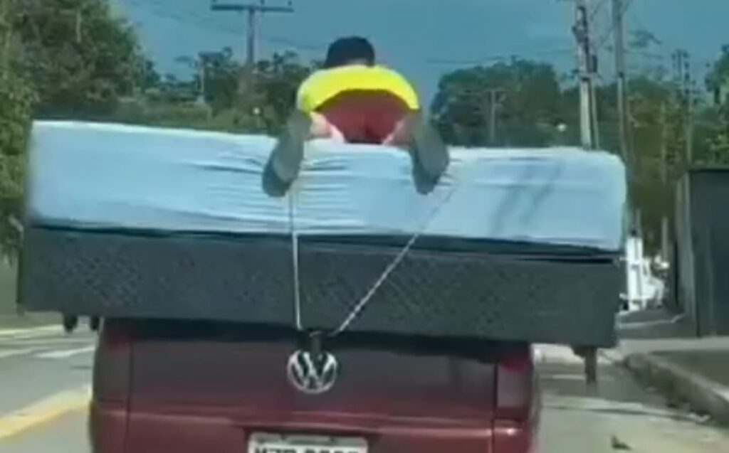 As imagens, que geraram inúmeros comentários, mostram que apenas a cama estava amarrada ao veículo, estando o homem sem nenhum tipo de proteção.