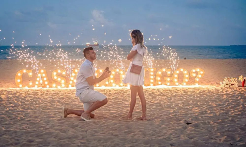 O empresário contratou um letreiro iluminado com a frase “Casa Comigo?”, além de um fotógrafo para realizar os registros do momento. Já as alianças acompanharam Celso durante toda a viagem à capital cearense.