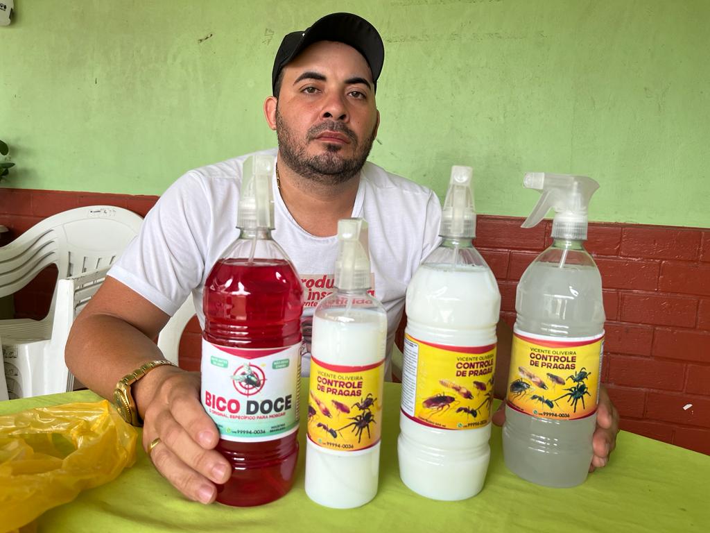 O químico Vicente Oliveira desenvolveu um produto com a finalidade de realizar o controle de pragas urbanas. O profissional trabalha com serviços de dedetização e garante que o produto elimina cupins, baratas, formigas, carrapatos, cupins, aranhas e outros insetos.