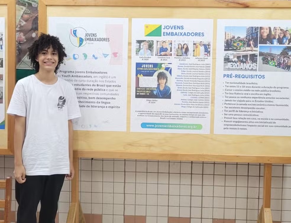“Estou me sentindo orgulhoso de mim mesmo”. Este é o sentimento que define o estudante Diego Heitor da Silva Monteiro, que está a um passo da viagem para os Estados Unidos que já ocorre nesta semana. Ele foi o único acreano escolhido para representar o estado no programa Jovens Embaixadores 2024 e compor a delegação de 46 jovens que irão aos EUA para um intercâmbio de três semanas com todas as despesas pagas.