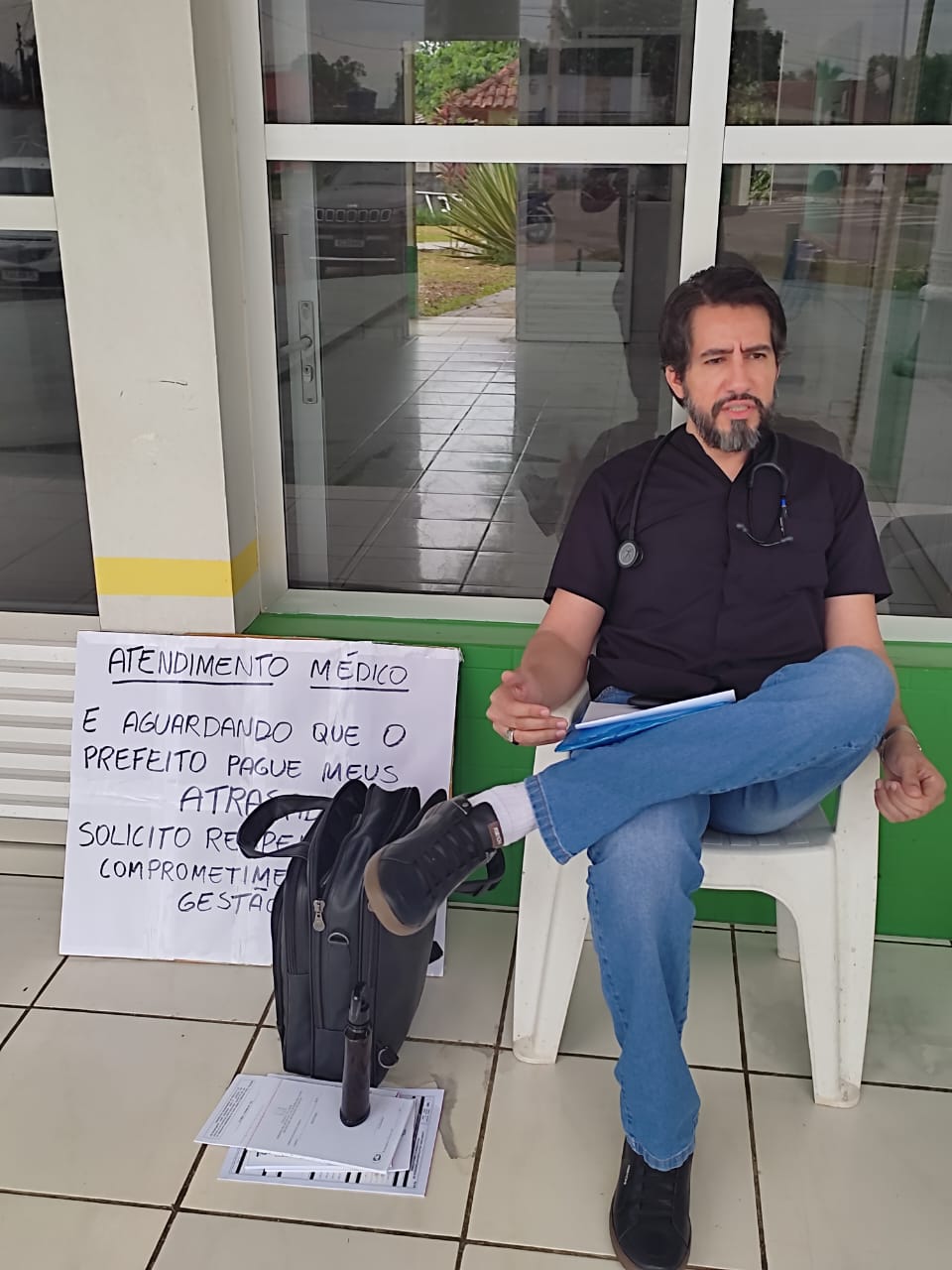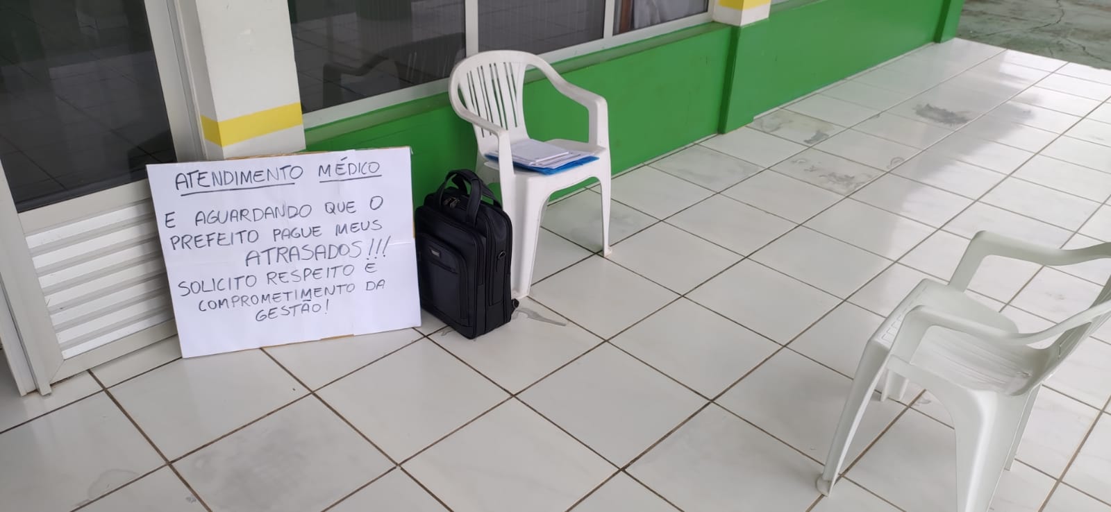 O cartaz comunicava a população que o atendimento médico seria realizado ali mesmo em frente à prefeitura, enquanto ele aguardava o pagamento. “Solicito respeito e comprometimento”, escreveu o médico.