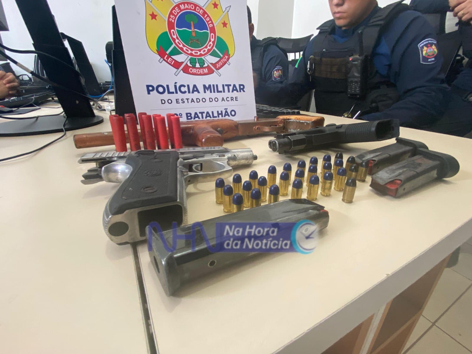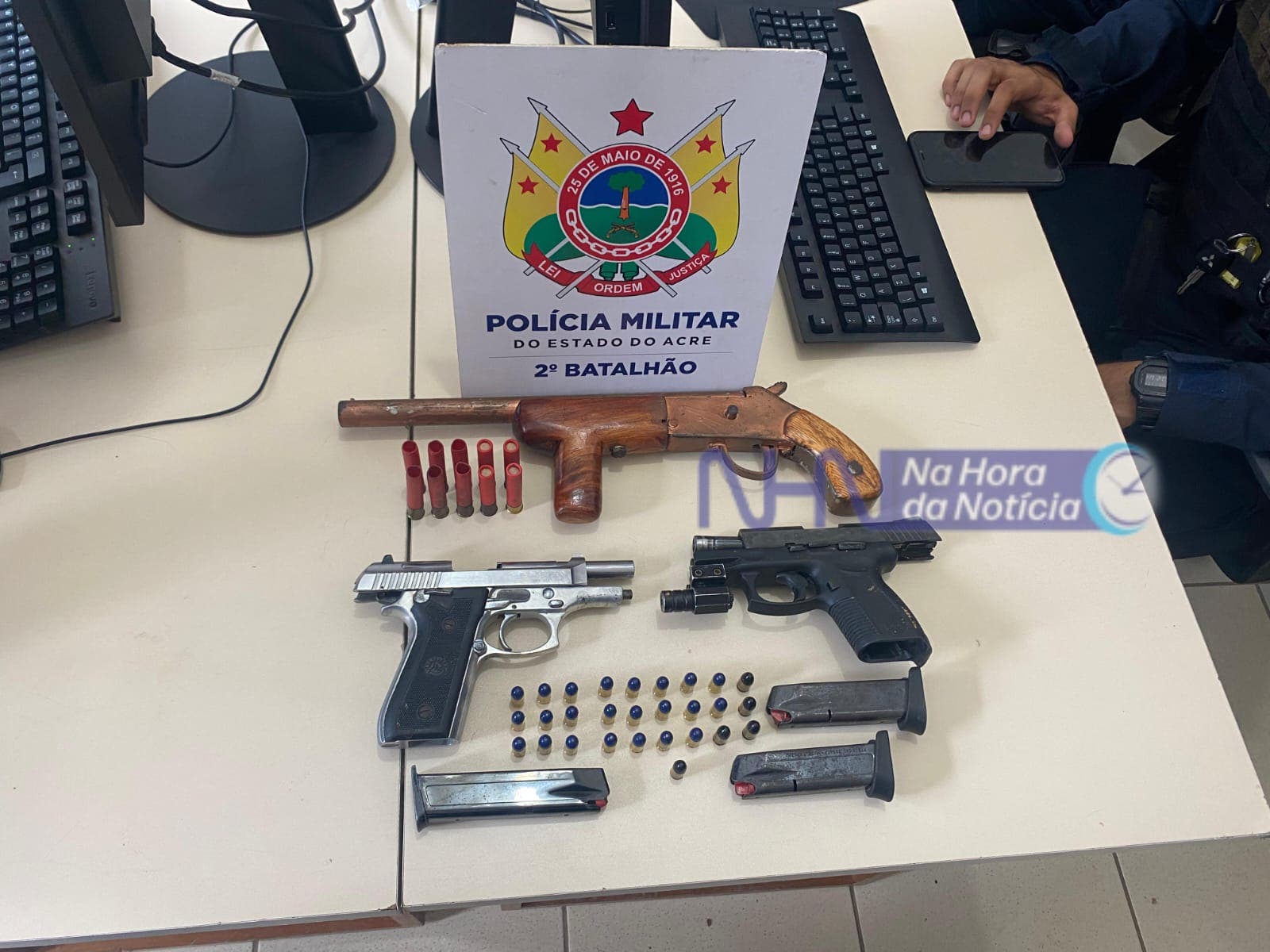 Roberto Freires de Lima, 42 anos, Elias Bega Tibúrcio, 25, e Edson Vitor de Lima da Silva, 22, foram presos acusados de integrar organização criminosa, efetuar disparos em via pública e porte ilegal de armas de fogo na manhã desta quarta-feira (31), na rua Praia do Futuro, no Loteamento Praia do Amapá, na região do Segundo Distrito de Rio Branco.