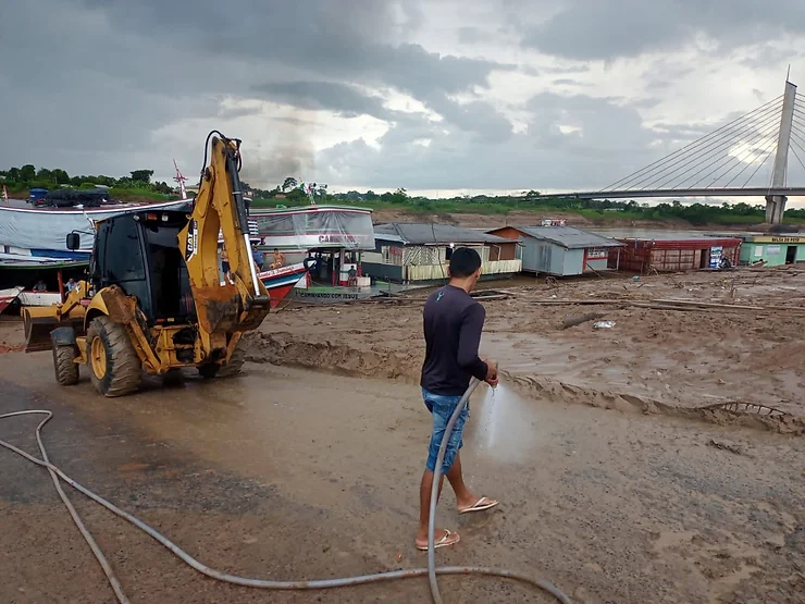 A vazante do Rio Juruá deixou lama no local, que é retirada com máquinas e equipe da prefeitura. A ação facilita a mobilidade para quem usa o ponto de embarque e desembarque de pessoas e mercadorias.