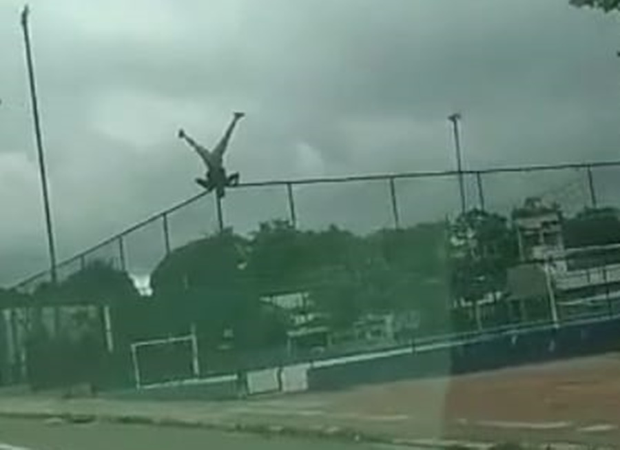 Em Cruzeiro do Sul, um jovem foi flagrado durante esta semana, arriscando-se, atrepando de pernas pro ar, nas grades que cercam uma quadra de futebol na Avenida Coronel Mâncio Lima.