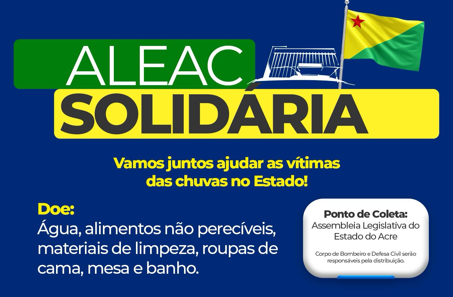 A mesa diretora da Assembléia Legislativa do Estado, lançou nesta segunda feira, 26, a campanha ALEAC Solidária, para arrecadação de donativos ás famílias atingidas pela enchente, na capital e no interior.