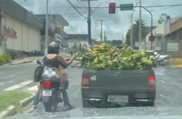 Em Cruzeiro do Sul, uma mulher, passageira em uma motocicleta, foi flagrada pegando bananas da carroceria de um carro, no momento em que estavam parados em um semáforo, na região central da cidade.