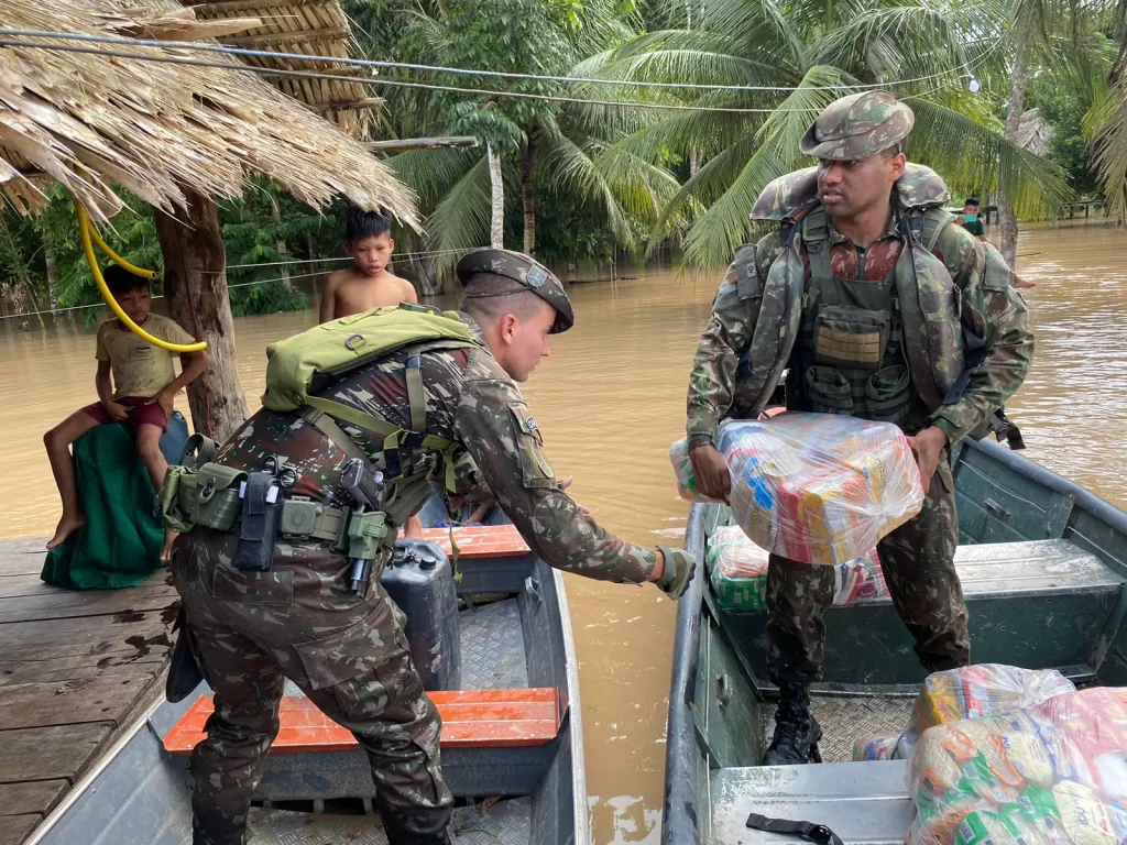 A cheia atinge níveis históricos e já deixou milhares de pessoas desabrigadas. Nesta segunda-feira, 26, os militares entregaram cestas básicas a aproximadamente 20 famílias indígenas, e fizeram o transporte dos moradores para locais seguros.