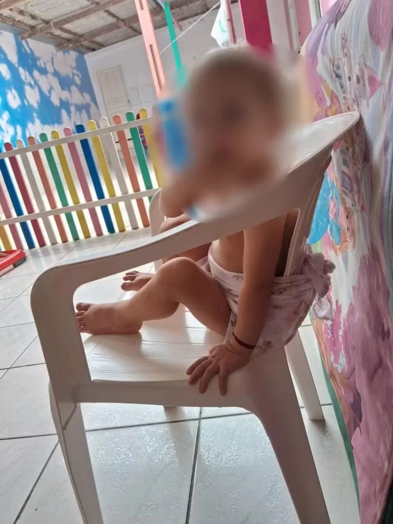 O g1 obteve, com exclusividade, imagens gravadas por funcionárias da creche que revelam uma criança amarrada em uma cadeira de plástico com uma fralda e chorando bastante. Outras imagens mostram crianças dormindo no chão dos cômodos ou em cima de pedaços de pano espalhados pela sala.