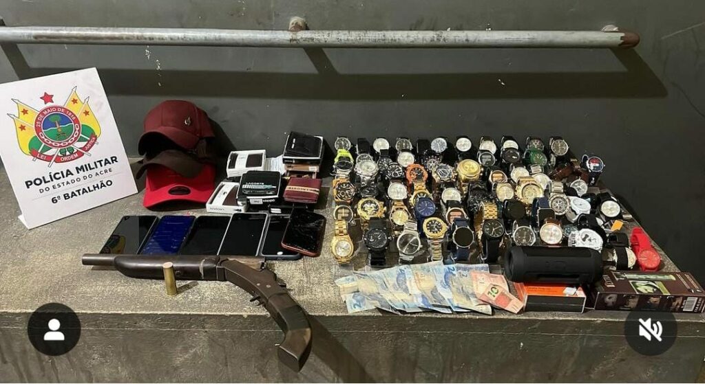 A lista dos bens recuperados inclui: 70 relógios, carteiras, aparelhos celulares, carcaças de celulares, bonés, caixa de som, fone de ouvido e máquina de cortar cabelo, além de 28 reais em espécie.
