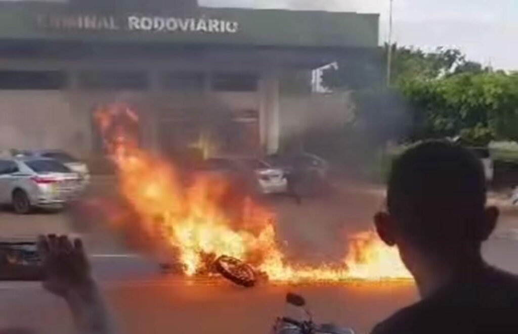 Uma motocicleta passou um problemas elétricos e pegou fogo na tarde deste sábado (25), na frente da Rodoviária de Epitaciolândia, na Avenida Santos Dumont, no Centro de Epitaciolândia, no interior do Acre.
