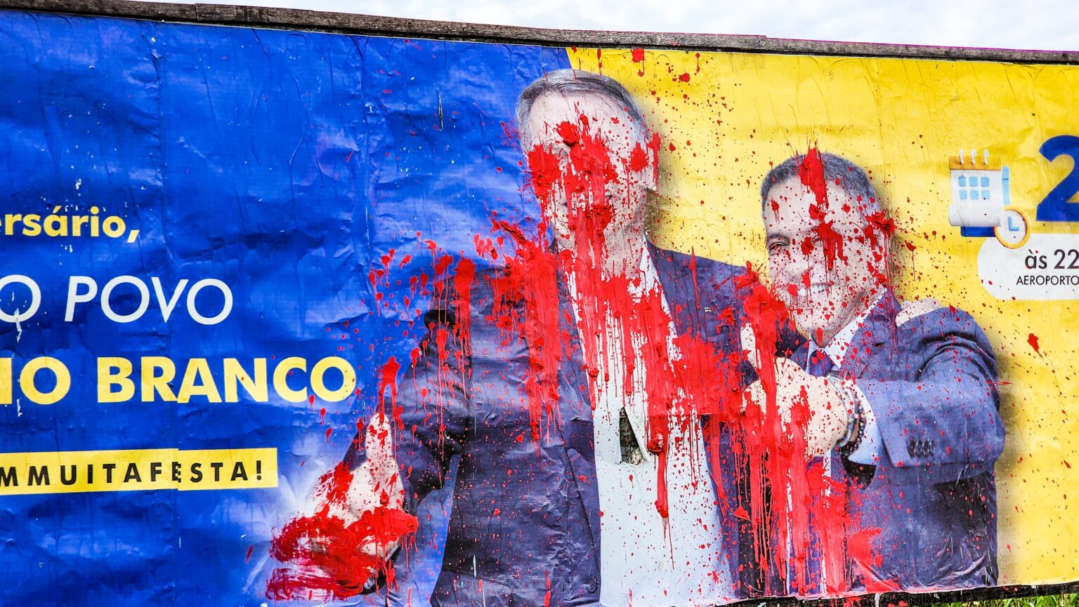 Os outdoors anunciando a chegada do ex-presidente Jair Bolsonaro a Rio Branco, espalhados pela capital acreana, foram pichados com tinta vermelha.