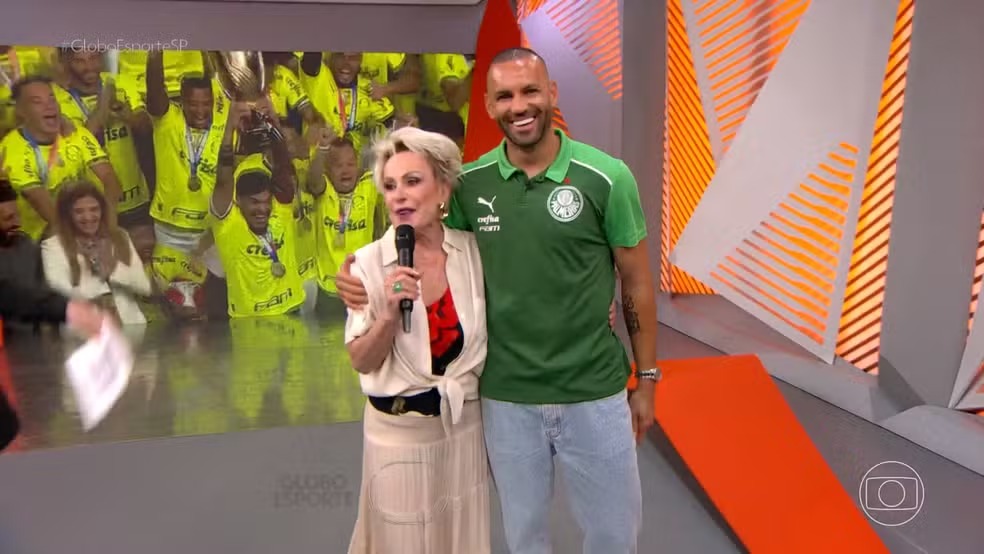 Ana Maria Braga e Weverton terminaram o Globo Esporte abraçados e cantando uma música da torcida palmeirense: “Sou Palmeiras, sim, senhor”.