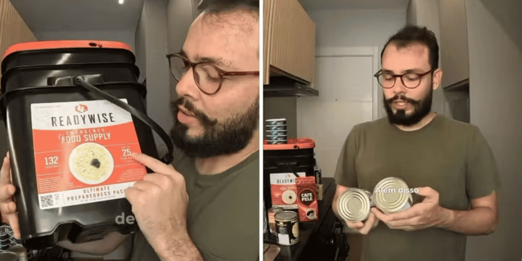 Em seguida, o brasileiro mostra sua coleção de enlatados composta por várias latas de atum, pêssego em calda, feijoada, carne de panela, tomate pelado e legumes em conserva. Na “despensa apocalíptica” também há café, galões de água, pastas de dente, lenços umedecidos, acendedores e um fogareiro. Ao todo, o kit de sobrevivência custou cerca de R$ 3 mil para ser montado.