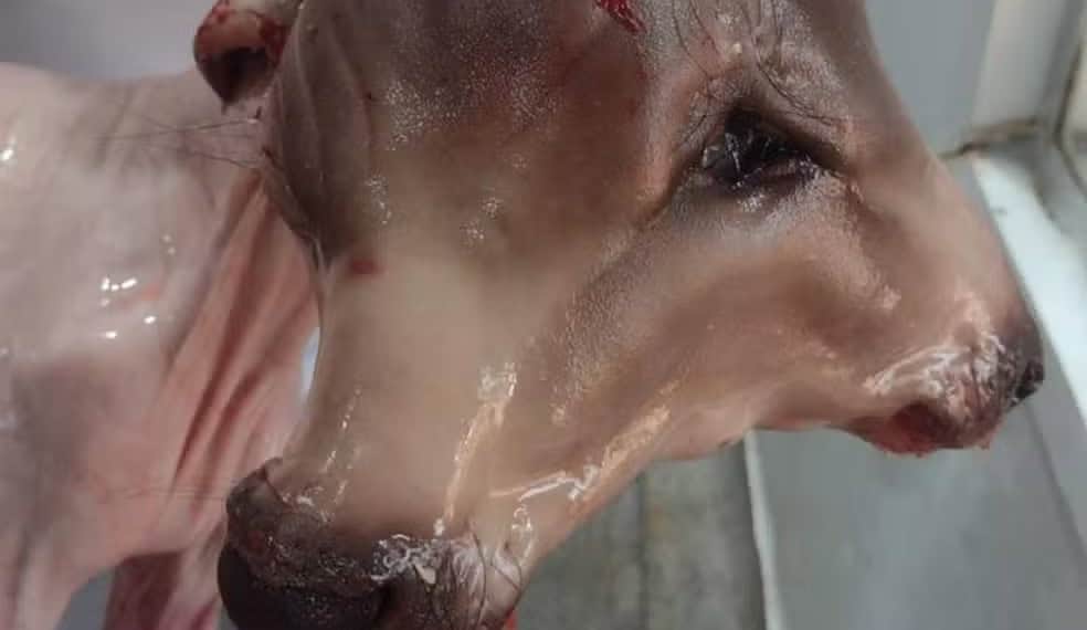 Um bezerro com duas cabeças foi encontrado dentro de uma vaca que foi abatida em um frigorífico, na sexta-feira (19), em Rianápolis, no centro goiano.