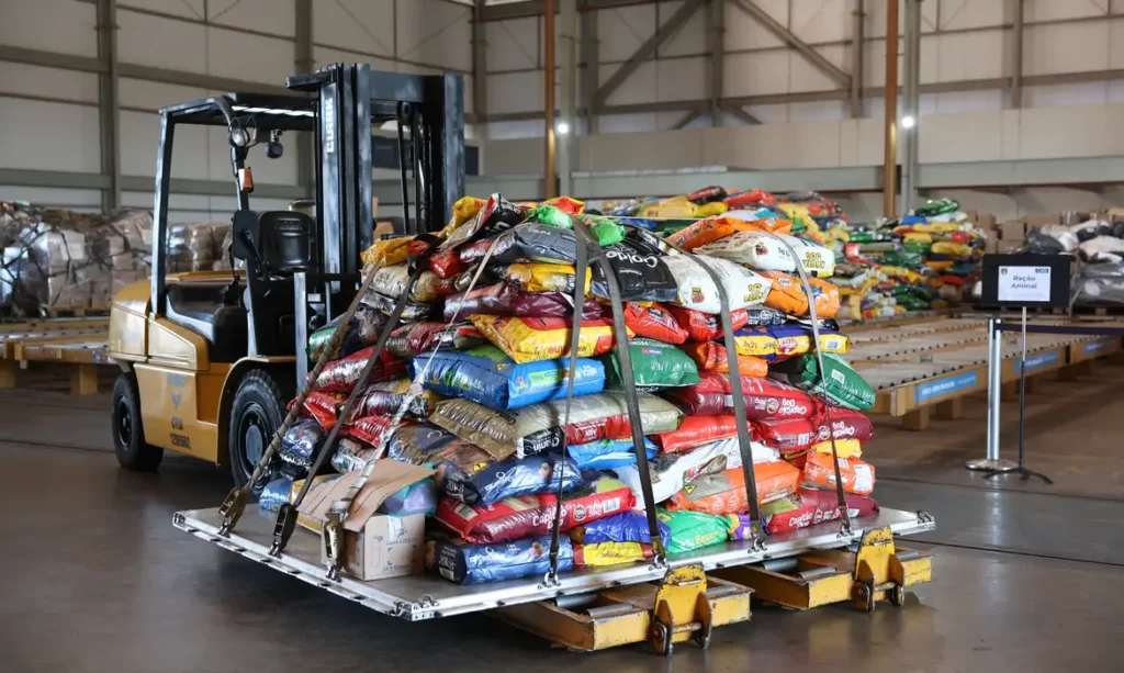 A Força Aérea Brasileira (FAB) embarcou na manhã deste sábado (18) 20 toneladas de ração doadas para o Rio Grande do Sul. Além da ração, para alimentar os cães e gatos vítimas das enchentes que devastaram a maior parte do estado, a aeronave KC-390 Millennium também levou itens essenciais para pets, como caixas de transporte, camas e bebedouros.