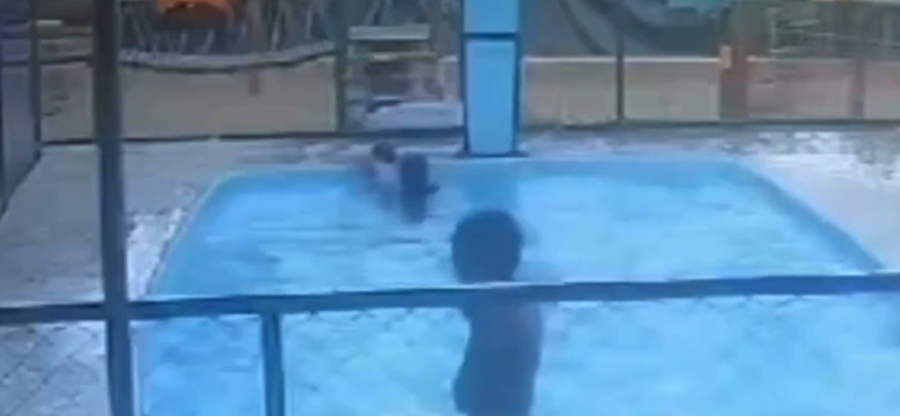 Imagens das câmeras de segurança capturaram o momento em que a mãe submerge na água com a criança e bate a cabeça dela na borda da piscina, conforme informado pela polícia.