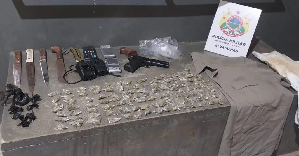 Na casa, foram apreendidos 30g de Pedra de Cocaína, 5 trouxinhas de cocaína, 110 trouxinhas de maconha, 4 facas, 3 balanças de precisão, uma calculadora, um rádio comunicador com carregador, um simulacro de arma de fogo, sacos para embalagem de entorpecentes e uma peça do fardamento antigo da Polícia Militar do Estado do Acre.