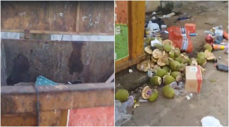 As imagens mostram a lixeira aberta e o acúmulo de resíduos ao redor dela, deixando livre para os animais espalharem o lixo às margens da rua, propagando o mal cheiro.
