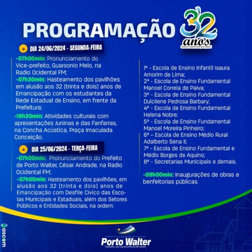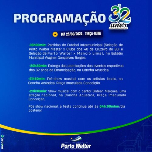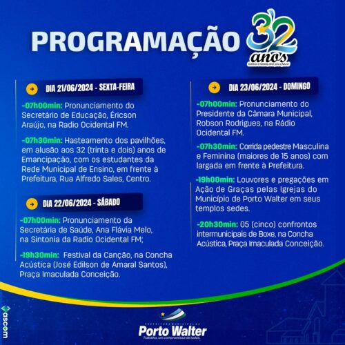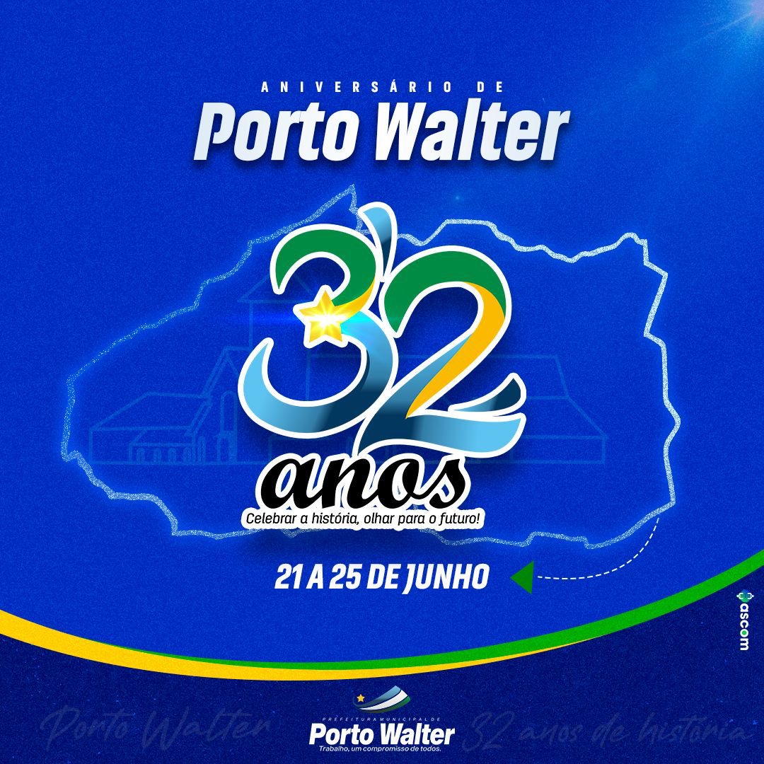 No próximo dia 25 de junho, o município de Porto Walter completa 32 anos de emancipação política e administrativa. Em comemoração à essa data marcante na história do Acre, a Prefeitura lançou nesta Segunda-feira (17/06), a programação alusiva a data. As atividades começam na Sexta-feira, 21 e se estendem até a Terça, 25.