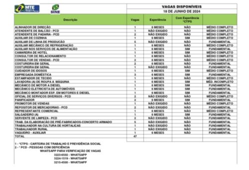 As vagas vão de promotor de ea representante comercial. É importante ressaltar que as vagas são rotativas e válidas apenas para o dia anunciado, podendo não estar mais disponíveis no dia subsequente. Para atendimento presencial, os interessados devem se dirigir à Organização em Centros de Atendimento (OCA).