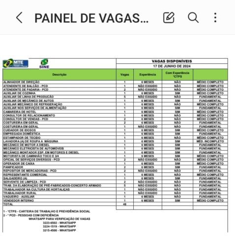 O Sistema Nacional de Emprego do Acre (Sine) está iniciando a semana ofertando 48 vagas de emprego nesta segunda-feira, 17, abrangendo uma variedade de setores. O atendimento aos interessados será realizado exclusivamente por meio de contato telefônico.