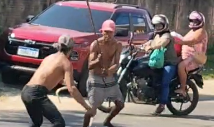 Na tarde desta quinta-feira, 28, dois homens foram flagrados brigando na área central de Cruzeiro do Sul. Um deles estava portando uma arma branca tipo faca e o outro estava segurando uma estaca, na tentativa de defender-se do oponente.