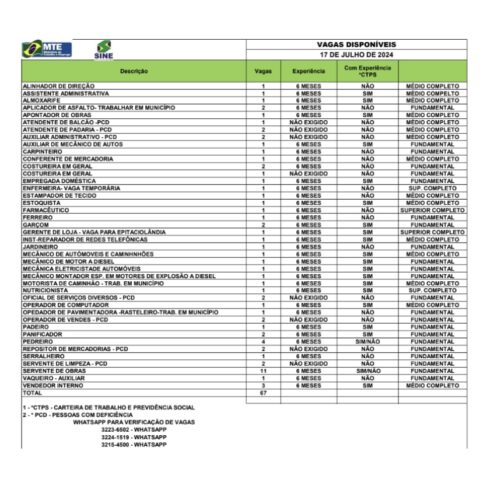 O Sistema Nacional de Emprego do Acre (Sine) divulga 67 vagas de emprego para diversas áreas nesta quarta-feira (17) em Rio Branco.