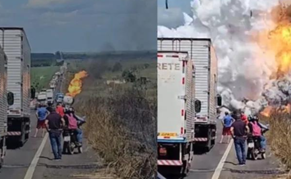 As imagens são impressionantes e mostram o caminhão carregado de combustível em uma explosão que assustou até quem estava mais longe da cena.