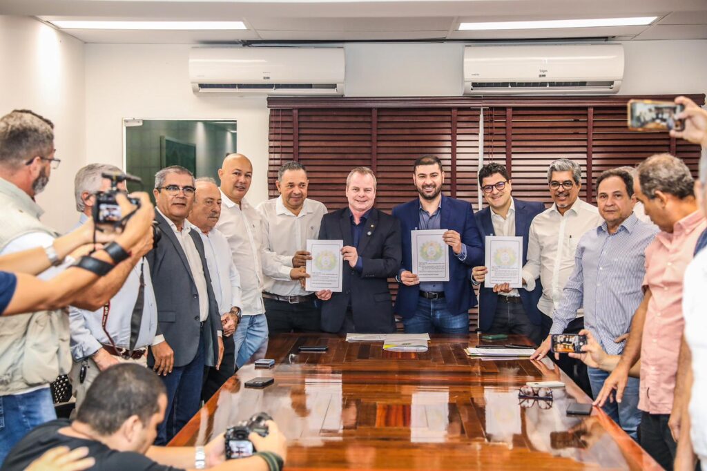 O deputado estadual Edvaldo Magalhães (PCdoB) participou do ato de promulgação das leis que tratam respeito da compensação ambiental, do licenciamento e da questão fundiária nas florestas públicas. A solenidade aconteceu na Assembleia Legislativa nesta segunda-feira (19) e contou com as presenças de deputados, empresários e presidentes de federações.