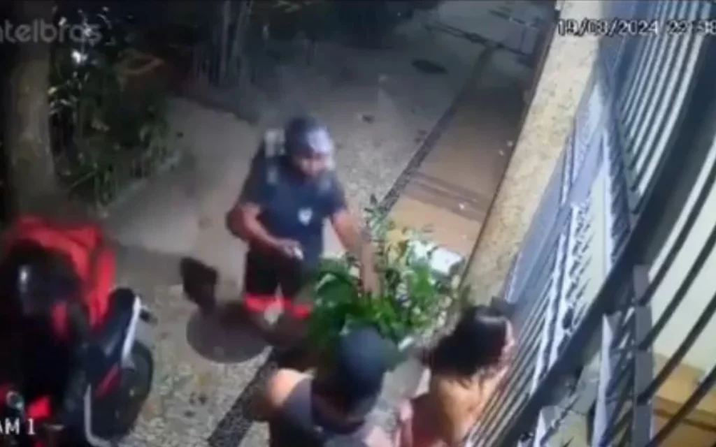 As três vítimas foram encurraladas contra as grades de um condomínio por um dos assaltantes que estava na moto. As vítimas tentavam entrar no prédio quando notaram o assalto. Em seguida, outro criminoso, armado, se aproxima e rouba os pertences do grupo. Logo após, o assaltante vai até a moto, mas volta para exigir que a vítima desbloqueie o aparelho. Ao ter a ordem atendida, ele foge rapidamente do local com o comparsa.