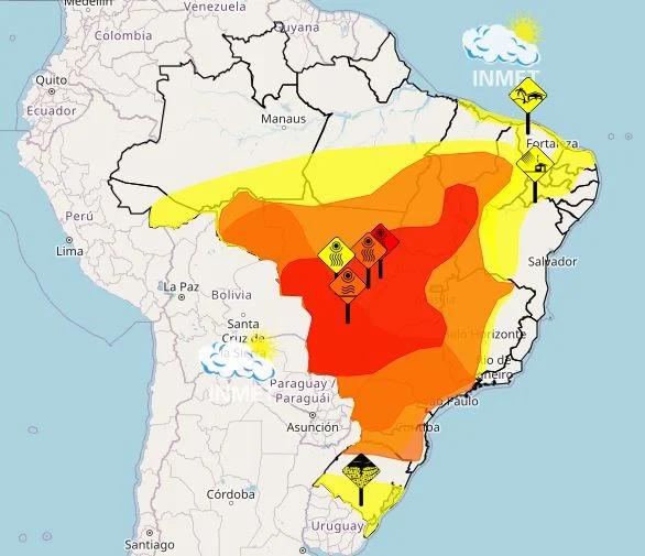 O Inmet emitiu ainda um alerta de ondas de calor para os Mato Grosso, Mato Grosso do Sul, Rondônia, São Paulo, Paraná, Santa Catarina e parte de Minas Gerais, Santa Catarina e Rio Grande do Sul. O alerta vale até a quinta-feira (12). Nesses estados as temperaturas podem ficar até 5ºC acima da média.