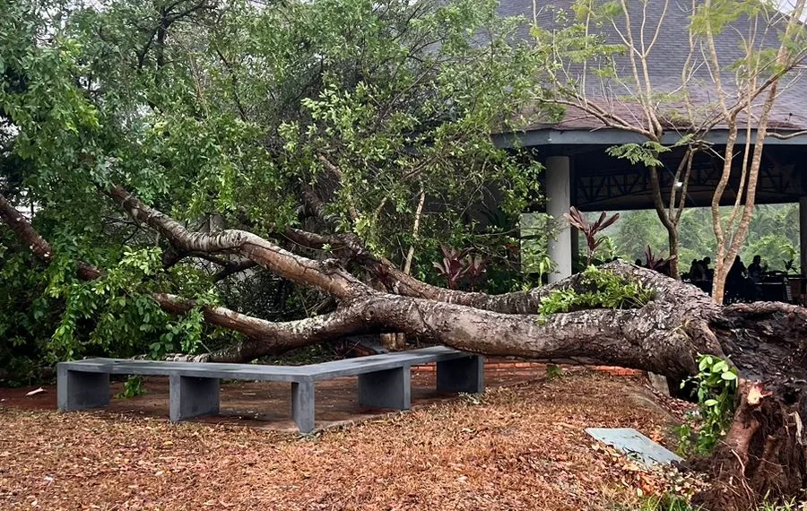 Felizmente, nenhuma pessoa ficou ferida com a queda da árvore, mas, aparentemente, o incidente causou danos nas proximidades de um quiosque de comidas da universidade.