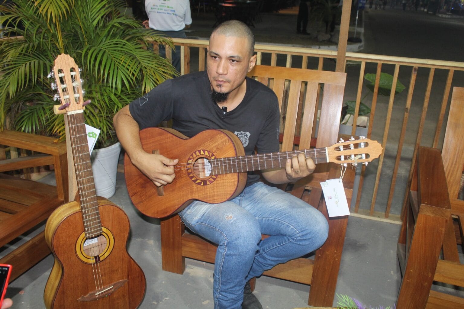 Violões fabricados na oficina Sons da Liberdade, por detentos de Rio Branco, chamam a atenção da população durante Expoacre 2024. Foto: Zayra Amorim/Iapen
